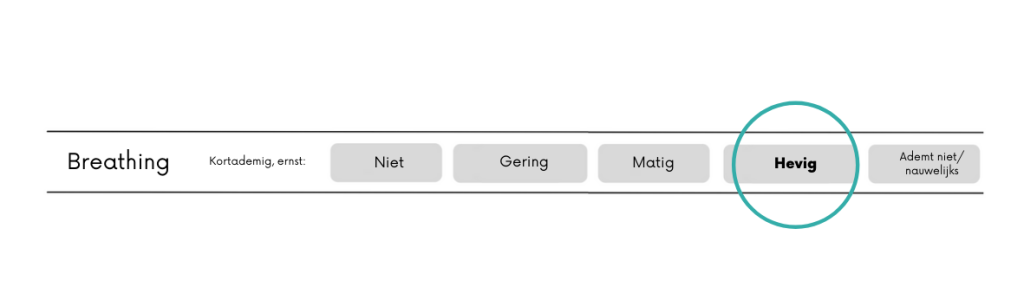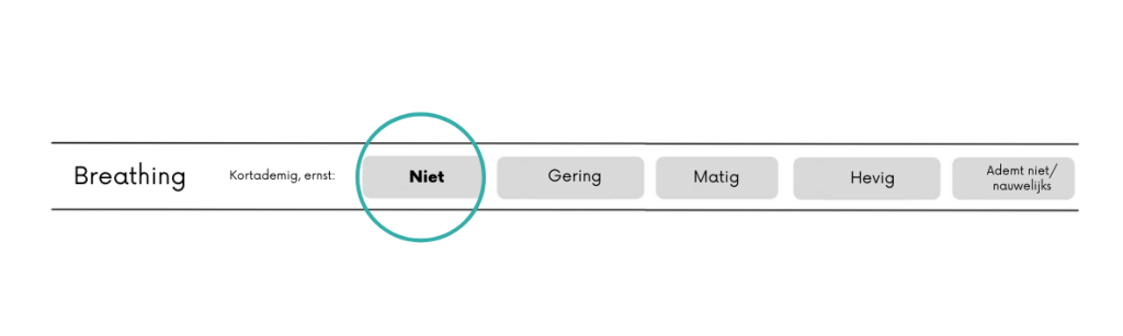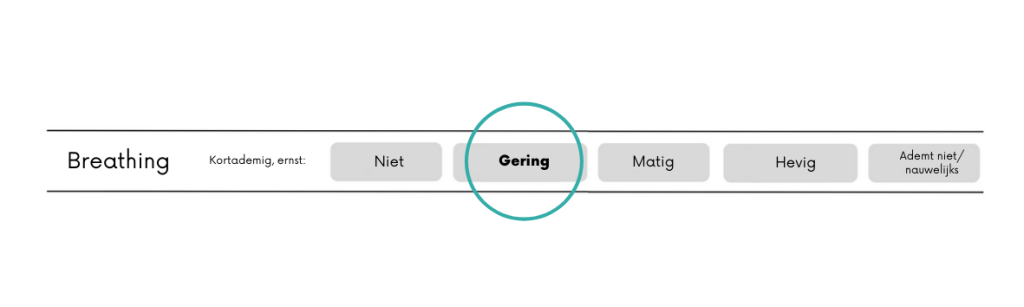 Wanneer de patiënt zelf aangeeft benauwd te zijn, is het (gevoel van) lichte benauwdheid, geen gebruik van hulpademhalingsspieren de score gering.