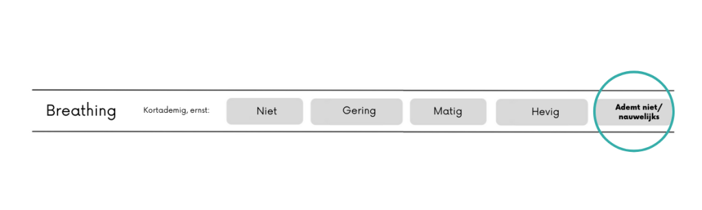 Triagecriteria voor de Breathing zijn belangrijk om uit je hoofd te leren. Wanneer een patiënt zelf belt en spreekt en ademhaalt zonder bijgeluiden stel je deze vraag alleen als het past bij de klachten. Zoals bij pijn op de borst kun je vragen ‘Hoe gaat het ademhalen?’ Of ‘Bent u bij de klachten kortademig?’ Doe geen aanname, misschien heeft iemand bij inspanning wel kortademigheid of benauwdheid die toeneemt.